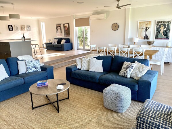 The lovely kitchen has a huge island bench perfect for leaning on with a glass of bubbles in hand. The kitchen overlooks a spacious dining and living space with stunning northerly views out over the water. You'll find everything you need in our fully equipped kitchen and butler's pantry to ensure your stay is hassle-free including a Nespresso coffee machine (BYO pods). Just bring your food and wine!