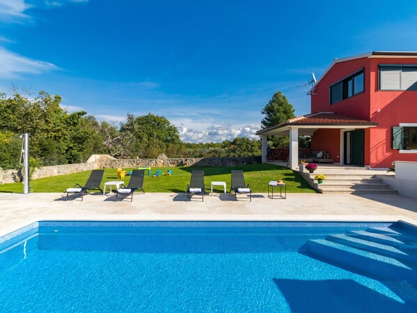 Beautiful single-family house "Brijunis blick", 2 storeys, built in 2019. 900 m from the centre of Peroj, 5 km from the centre of Fažana, 5 km from the centre of Vodnjan, in a quiet, sunny position, 400 m from the sea, 400 m from the beach, in the countryside. Private: property 715 m2 (fenced), garden with lawn 400 m2 wildlife garden, swimming pool angular (8 x 4 m, depth 150 cm, seasonal availability: 17.May. - 30.Sep.) with internal staircase. Outdoor shower, terrace (24 m2), garden furniture, barbecue, pool maintenance by the owner/gardener. In the house: internet access, storage room for bicycles, burglar alarm system, washing machine. Available: bicycles (7). Airport transfer (extra). Motor access to the house (40 m via unmade road). Parking (for 2 cars) at the house on the premises. Shop 900 m, supermarket 5 km, restaurant 400 m, café, bus stop 900 m, pebble beach, rocky beach. Marina, walking paths from the house 400 m, cycle lane 450 m, children's playground 1 km. Please note: suitable for families. The owner does not accept any youth groups. Airfield 13 km from the property. Video surveillance of the property. Private:outdoor kitchen (4 hot plates, refrigerator). Available: 4 electric scooters, 4 stand up paddle boards (all included).