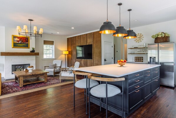 The main living space is a bright and airy open floor plan combining the living room, kitchen and dining room. If you’re traveling as a foursome, the top-grain leather sofa converts to a queen bed and all the linens and amenities needed for the two extra guests will be ready for your arrival. Pour your wine or cocktails in the bar area and sit at the expansive kitchen island as you prepare your food in the fully equipped kitchen. Enjoy your meals at the dining table overlooking the mountain views. Watch your favorite programs on the 75" Smart TV or just enjoy conversation or a good read in the comfortable living room with the candlelit fireplace.