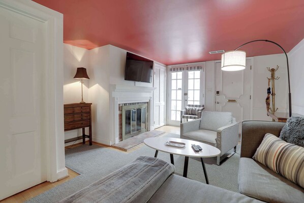 The fireplace is a charming decorative feature, meant to add ambiance rather than be used.