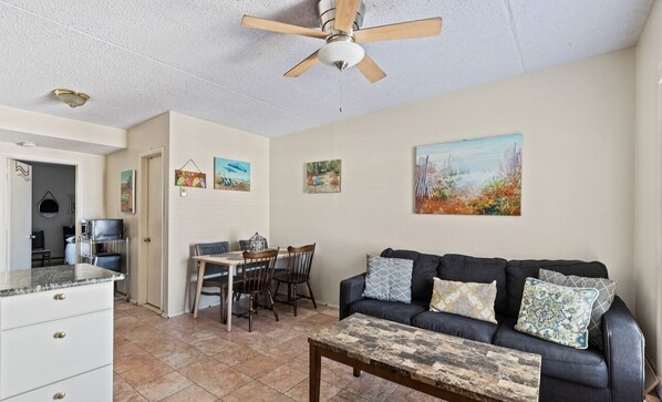Your perfect beach getaway awaits! Just steps from the Wildwood boardwalk, this fully furnished 1-bedroom condo comfortably sleeps 4 with a twin bunk bed, double bed, and an extra twin. Relax in the inviting living area or enjoy your favorite shows—Netflix, Peacock, and Apple TV are all included, along with fast, free wireless internet. Whip up meals in the convenient kitchen featuring a full-size fridge, stove/oven, and microwave. After a fun-filled beach day or thrilling rides, come back and cool off in the private on-site pool (seasonal).