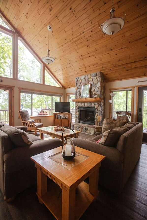 Enjoy the private, lakefront chalet surrounded by scenic wooded trails, multiple docks, and peaceful spots perfect for relaxing or exploring. Soak up the sun and spend time on the water with included kayaks, a canoe, paddle boat, and pontoon! Take a short ride to the lakefront bar and grill, or have ATVs and jet skis delivered right to the property for even more adventure.
