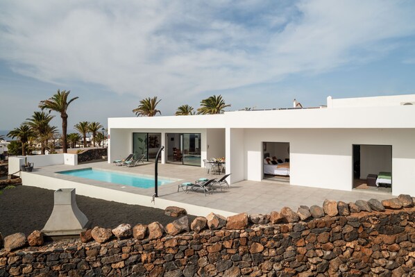 Step outside, and you'll discover your own private oasis. The pool area is a haven for relaxation, complete with an inviting 8-meter heated pool, perfect for a refreshing dip year-round. Four sun loungers invite you to bask in the sun's warm embrace, while an al-fresco dining table sets the stage for unforgettable meals under the Lanzarote sky.