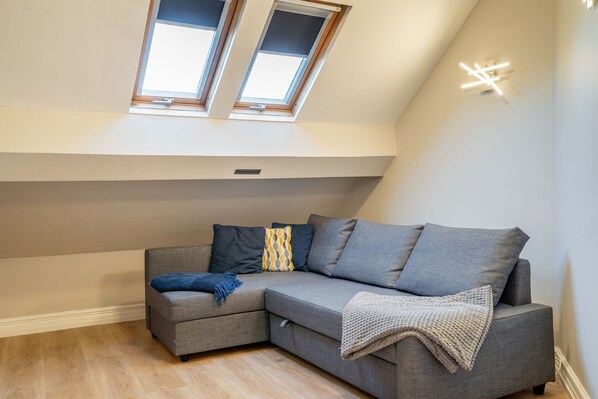 The open plan living and kitchen area is bright and airy, thanks to Velux windows that let in natural light. The lounge offers comfortable seating around a Smart TV for entertainment, while the fully equipped kitchen has everything you need for a relaxing stay.
