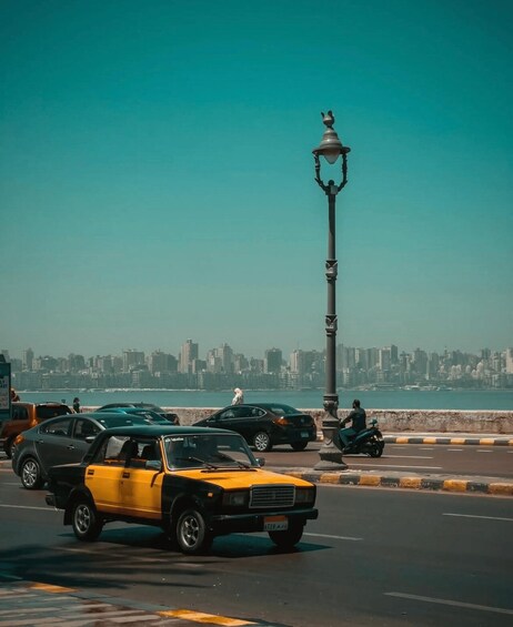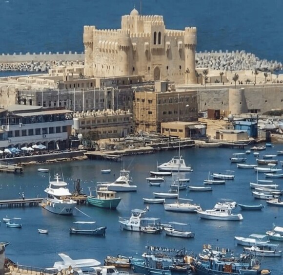 反対側にはコルニッシュと旧港があり、古い漁船や漁をする男たち、網を作る伝統的な漁師たちを見ることができる。その後、古代世界の七不思議のひとつ、アレクサンドリアの灯台と同じ場所に建てられたカイトベイ城の外観を見学。