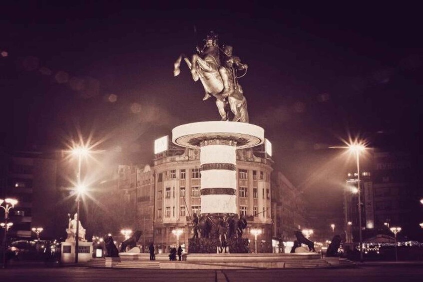 川の対岸にはメイン広場のマケドニア広場があり、新しい彫像や記念碑がたくさんあります。広場と旧駅を結ぶメインストリート、マケドニア通りに沿って歩きます。マザー テレサ記念館に短時間滞在し、古い駅の建物内にあるスコピエ市博物館の前でツアーは終了します。