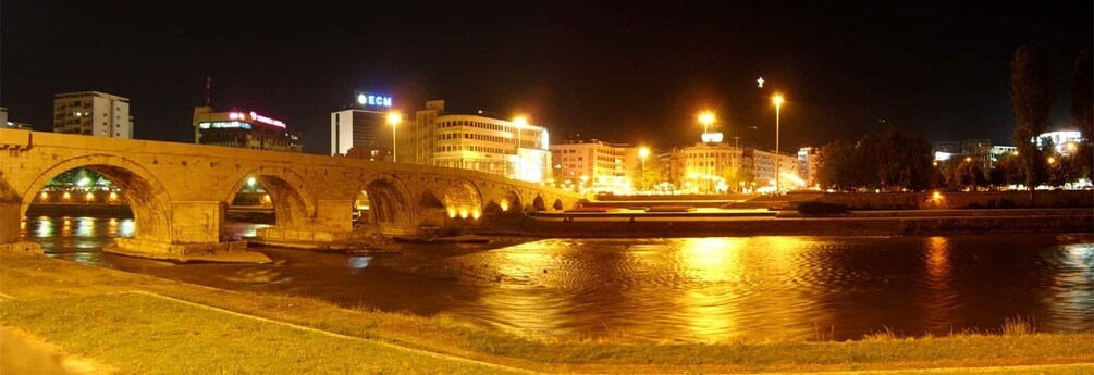 ツアーは市内の近代的な部分に向かって続きます。スコピエの最古のランドマークの 1 つである石橋を渡る前に、マケドニア ユダヤ人ホロコースト記念センターとマケドニア独立闘争博物館、IMRO、共産主義の犠牲者を見ることができます。