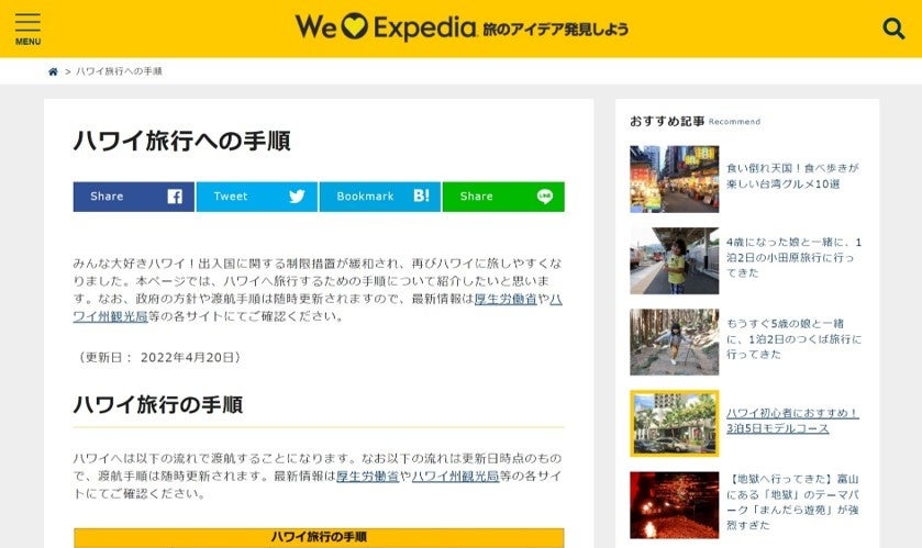 エクスペディアグループ エクスペディア・ホテルズドットコムの広報代表であるZoe Chanは次のようにコメントしています。「結婚式を挙げる場所やハネムーンとして長年人気を誇っていたハワイへの出入国において取られていた制限措置が緩和された今、夫婦やカップルのハワイへの旅行需要が高まることが予想されます。エクスペディアはそのような方たちが久しぶりの旅行を十分に満喫できるよう、旅行するための手順や最適なプランを提供することでコロナ禍の旅行をサポートしたいと考えています。」