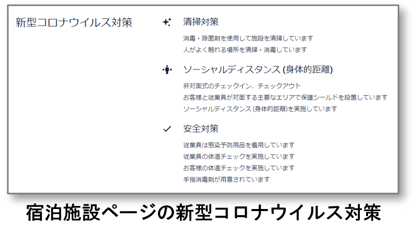 「新型コロナウイルス (COVID-19) トラベルアドバイザー」では、渡航先の規制や安全衛生に関するガイドライン、旅行時のアドバイスについて検索できます。また各宿泊施設の詳細ページでは、感染症対策を簡単にチェックできるようになっています。(新型コロナウイルスに関連する最新の旅行情報については、予約前に関連する政府当局の旅行ガイドラインをご確認ください )
