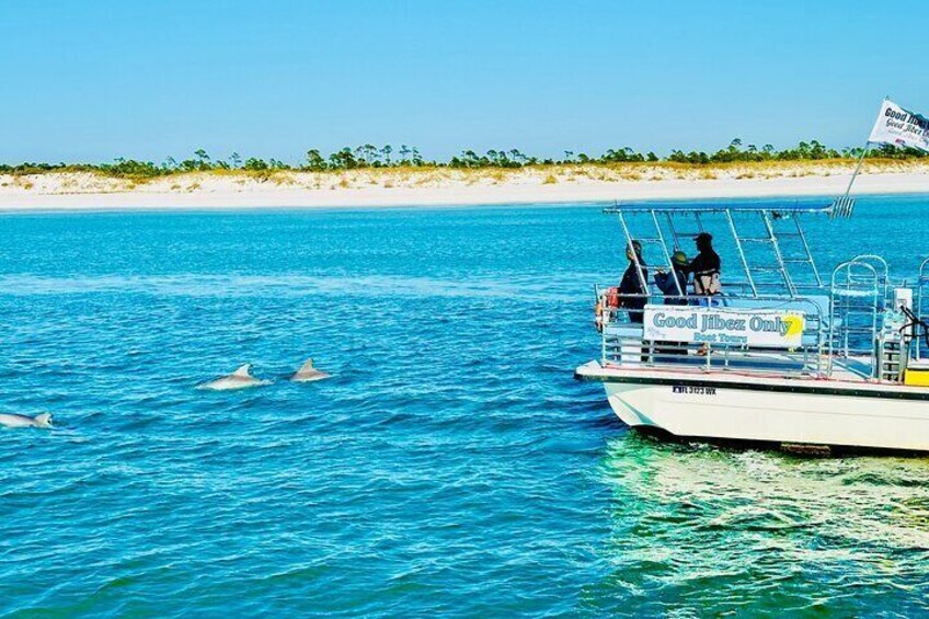 メキシコ湾のエメラルド色の海を楽々と滑走する、思い出に残る 1.5 時間のクルーズに参加してください。広々とした安定したポンツーンは、十分な座席と息を呑むような景色を遮るものなく眺めることができ、家族や 18 人までの小グループに最適です。波の中で戯れるイルカやその他の沿岸の野生生物に目を光らせてください。