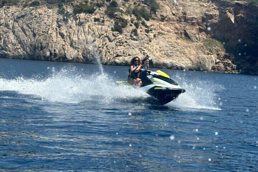 Discover the beauty of Ibiza’s west coast on this high-energy 30-minute jet ski adventure to Cala Salada, one of the island’s most iconic coves.