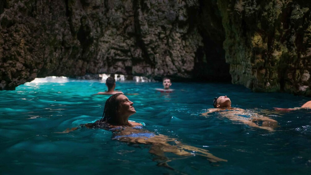 • 高さ15メートルの崖の下にあるクリスタルブルーの洞窟の中でシュノーケリングを楽しむ。