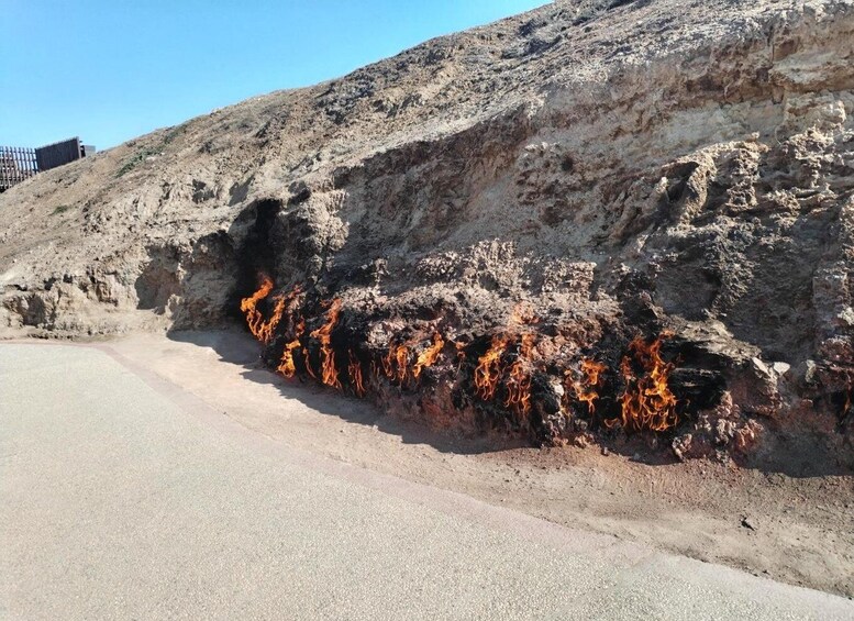 The final stop is Yanardag - Burning Mountain, located 30 minutes from the Fire Temple. This natural eternal flame has burned continuously for centuries, with flames reaching up to 3 meters high from porous sandstone vents. Yanardag produces a steady, mesmerizing wall of fire, especially dramatic at dusk. Guests spend 30 minutes observing this natural wonder while enjoying panoramic scenery.