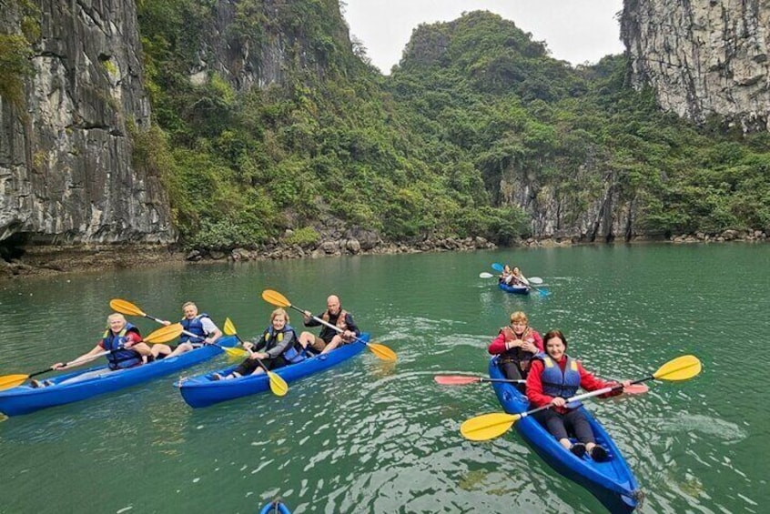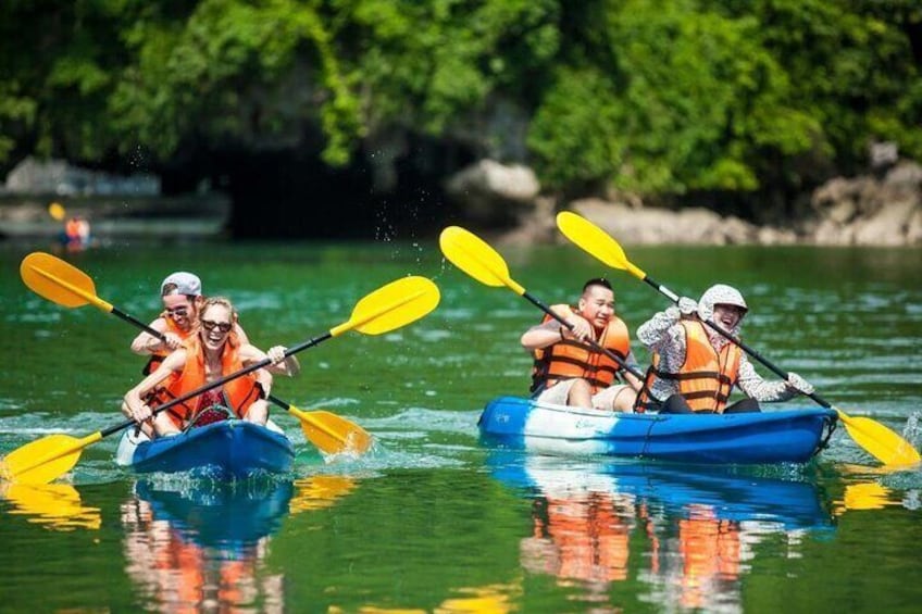 Lan Ha Bay - Ha Long Bay: Explore Dark & Bright Cave, kayak at Ao Ech, join a hands-on cooking class, and enjoy a vibrant sunset party on the sundeck.