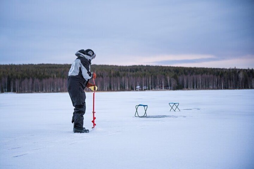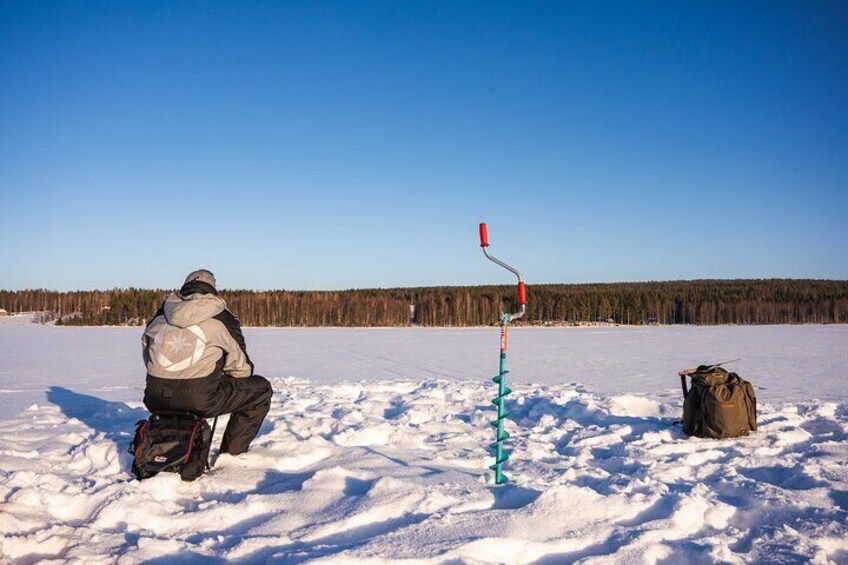 ロヴァニエミからミニバンで 20 分ほど移動し、湖までは歩いてすぐです。湖は静かな自然の真ん中にある、人混みから離れたプライベートな場所です。メインのアクティビティはもちろん釣りですが、凍った湖は風景や野生動物の写真を撮るのにも理想的な場所です。